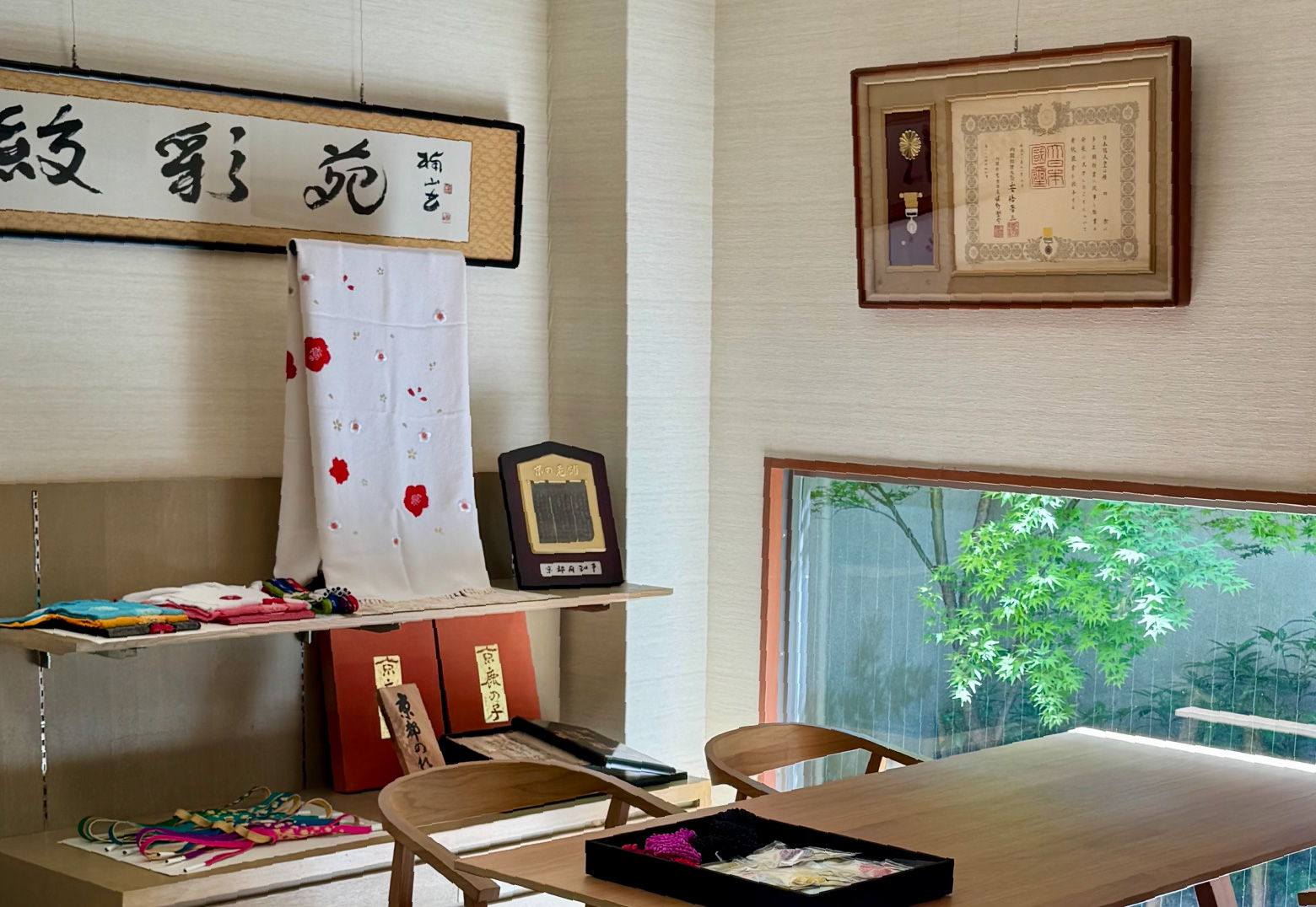 京都五条に佇むプライベートな和の空間。写真では伝わりきらない、絞り独特の立体感としなやかな風合い、そして奥行きのある色。