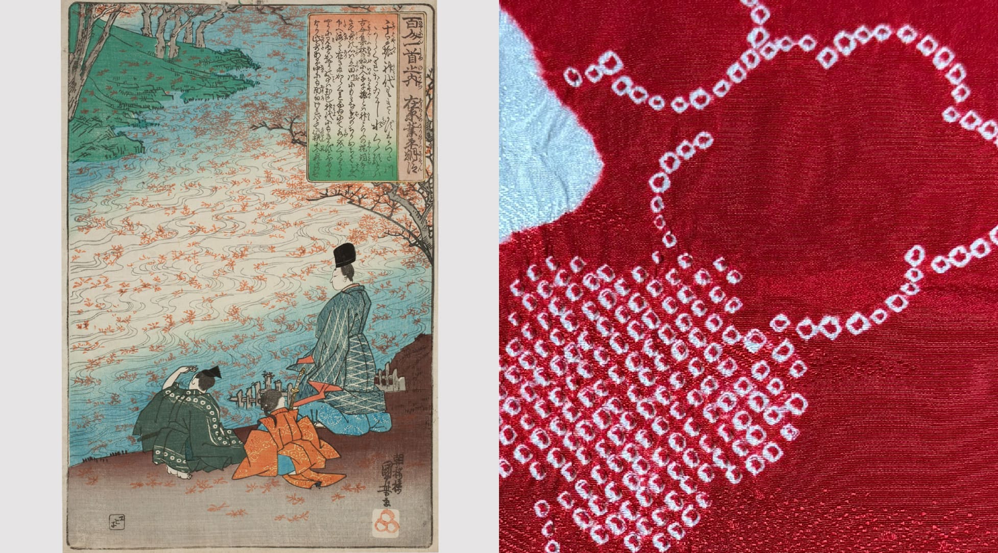 水面に映える真っ赤に紅葉した落葉の美しさを、あの素晴らしい絞り染めのようだと詠ったものです。