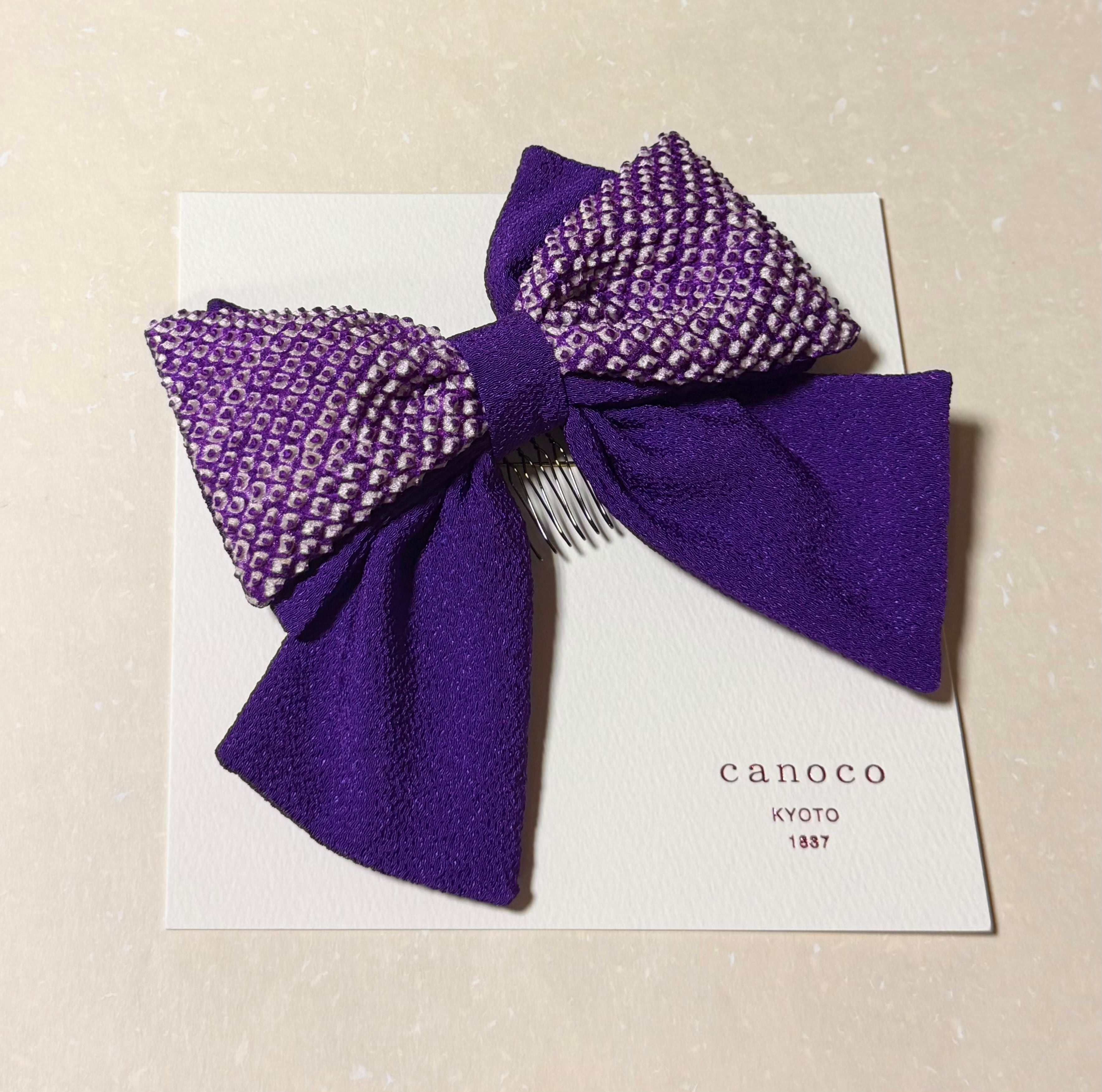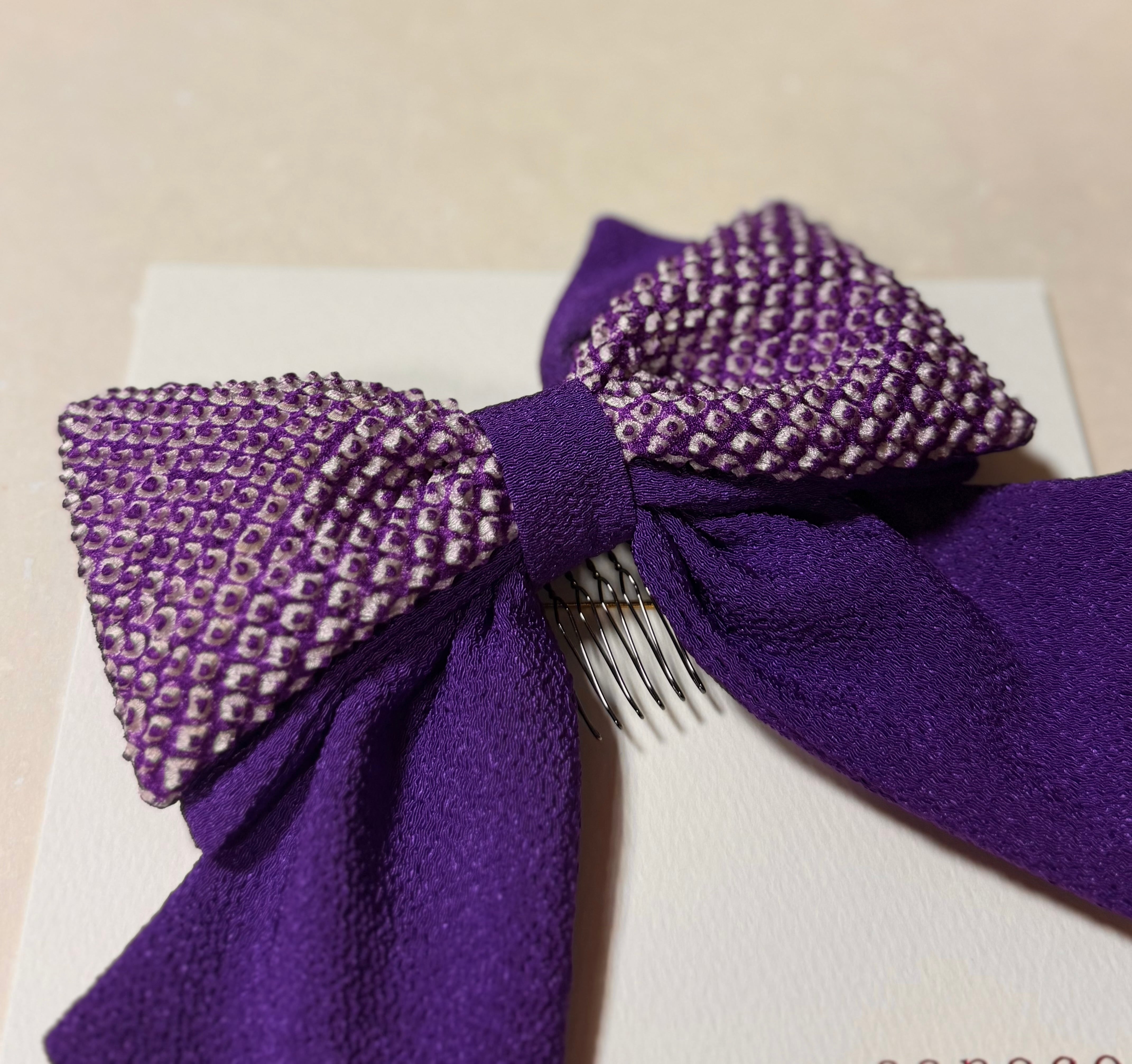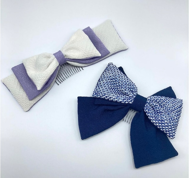 大きめのリボンが可愛らしいこちらの髪飾りは同色の縮緬をを重ねることで、振袖袴姿に一層映える華やかで豪華な髪飾りで、ハーフアップのヘアスタイルにおすすめです。