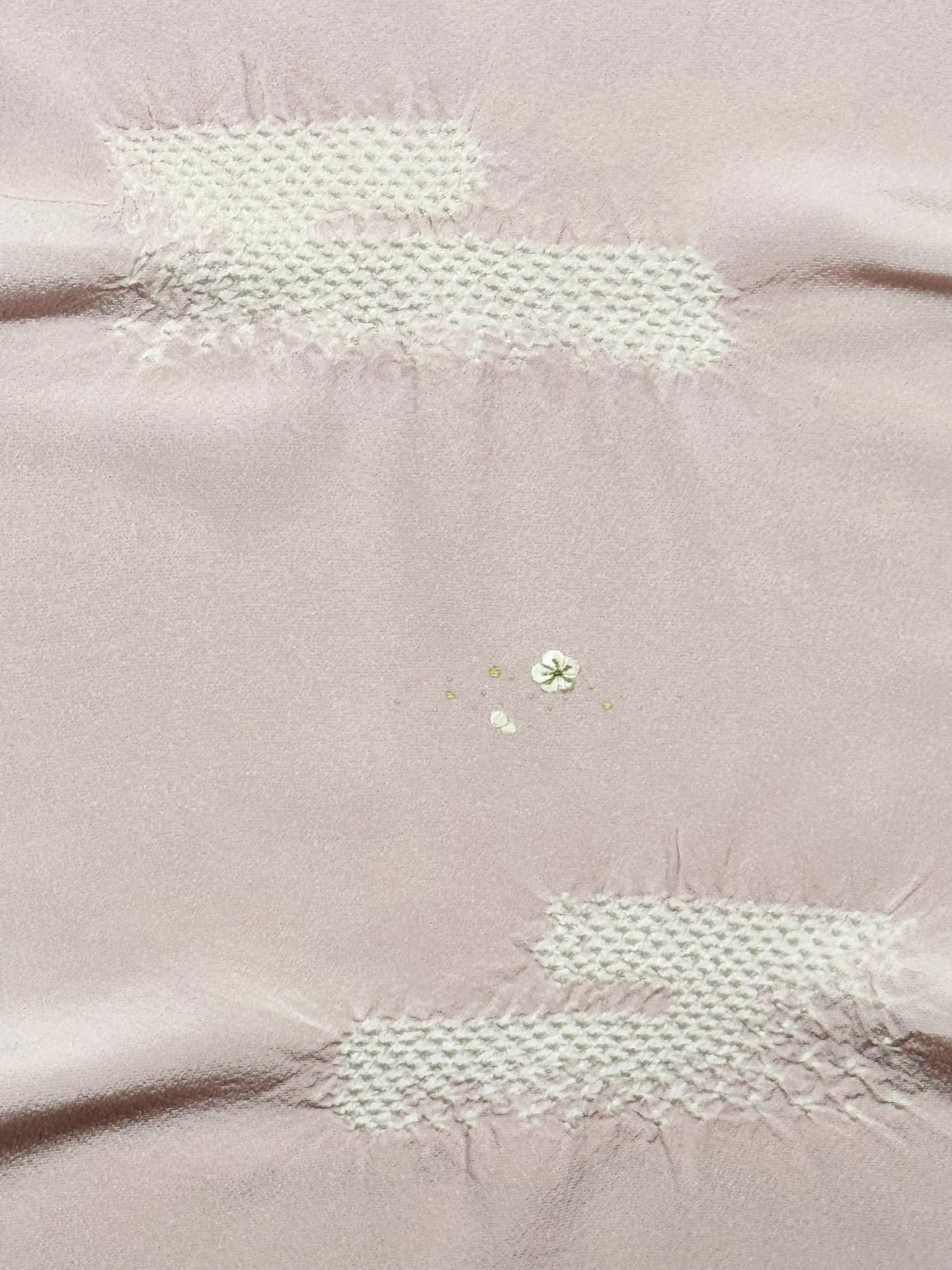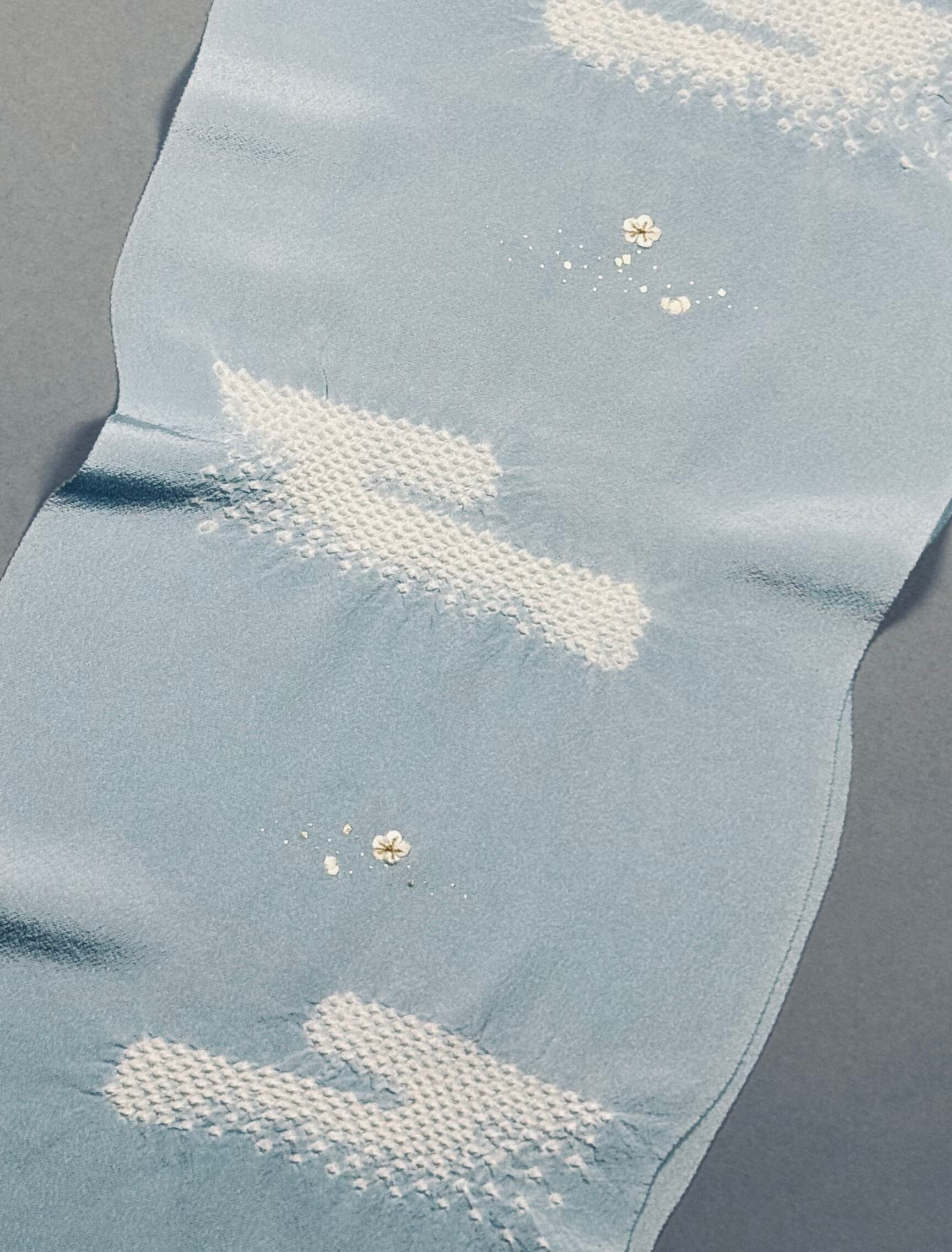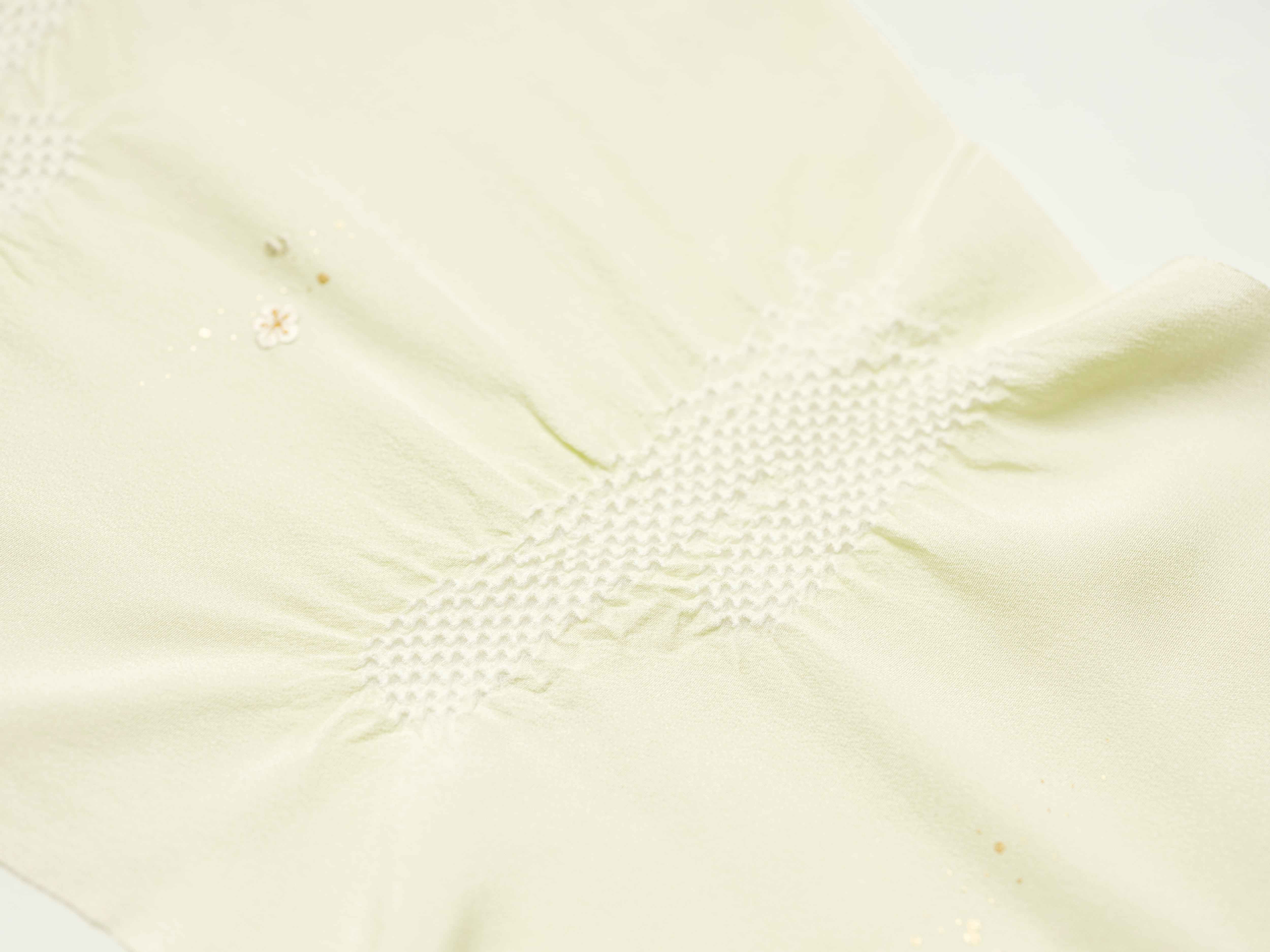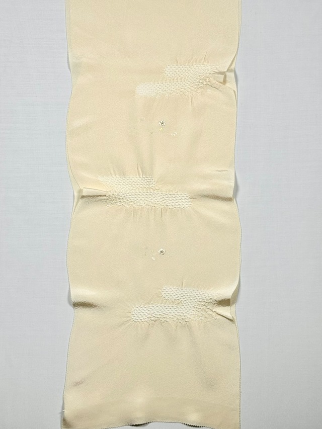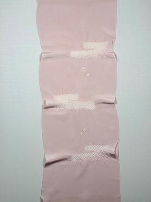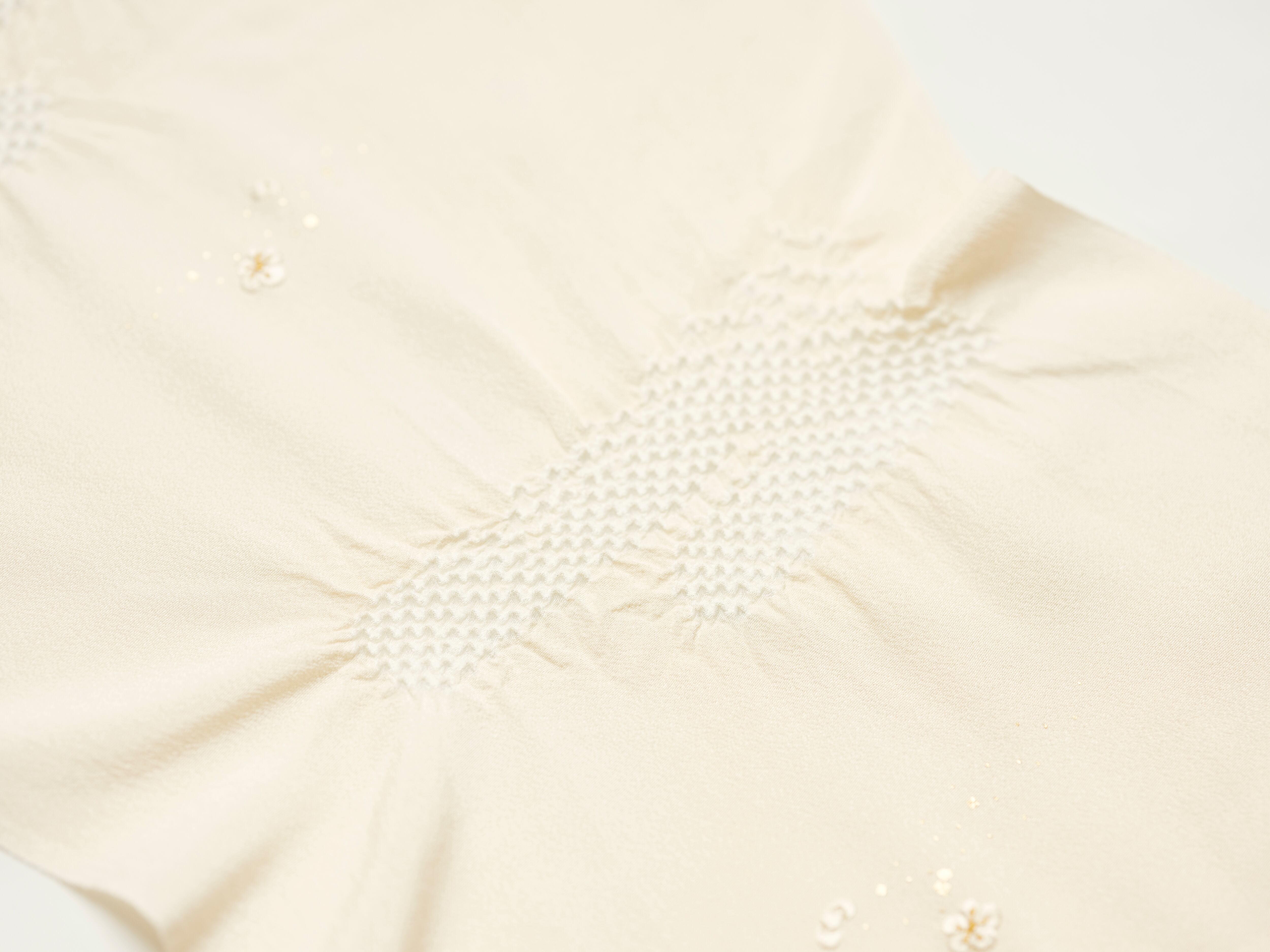 上品な光沢のある丹後ちりめんを使用し、日本古来の吉祥紋様のエ霞(えがすみ)を絞りでかたどった美しい帯あげです。絞りの配置によるぼかしの技法を効果的に用い、現れては消える霞がたなびく様子を表現しました。 美しい光沢感と繊細な小花の刺繍が魅力です。優雅で華やかなデザインながら、優しい絞りと落ち着きのある色合いが訪問着との相性抜群です。 卒業式や入学式などに参列されるお母さまの装いにおすすめです。 絹100% 日本製