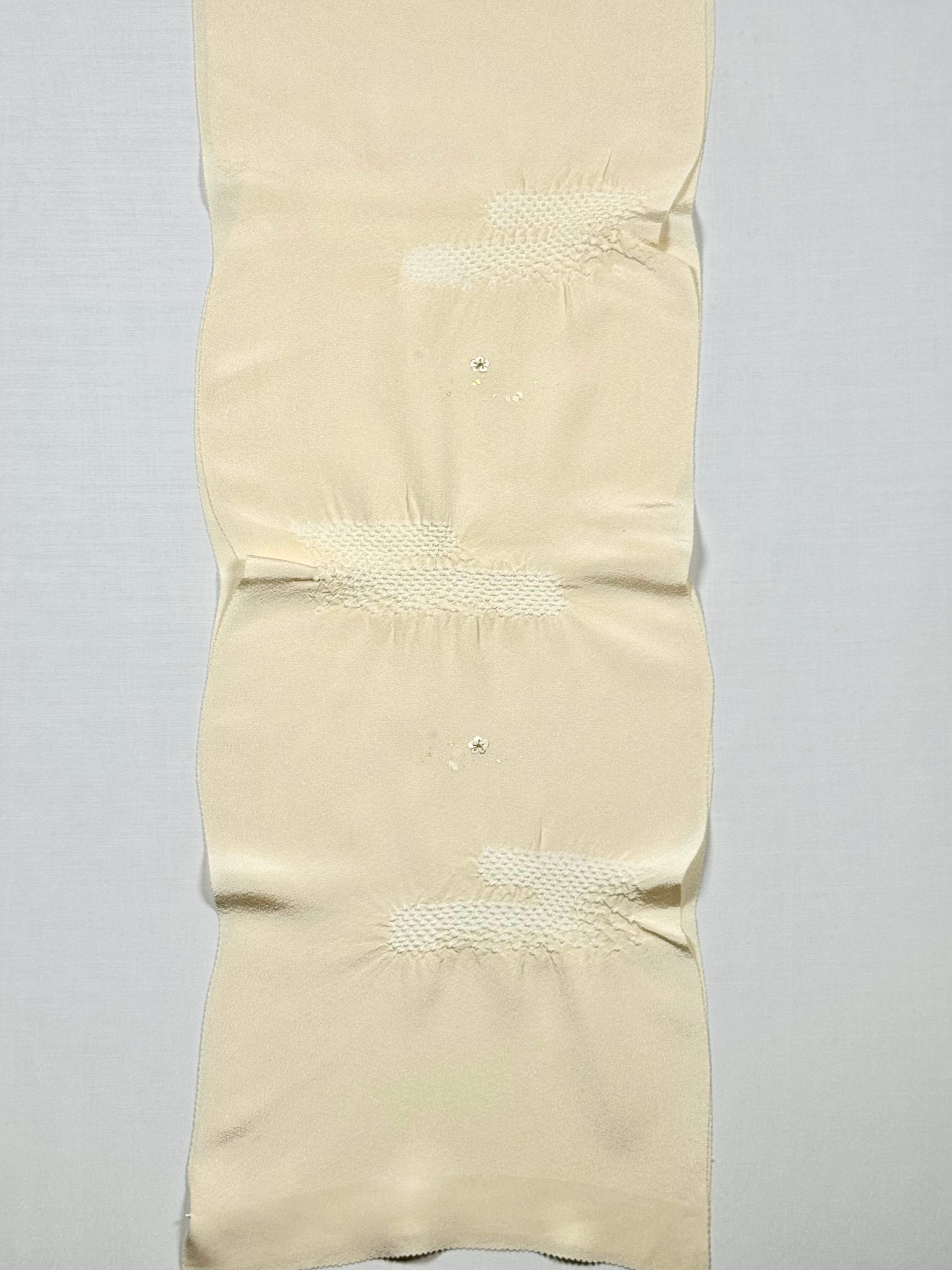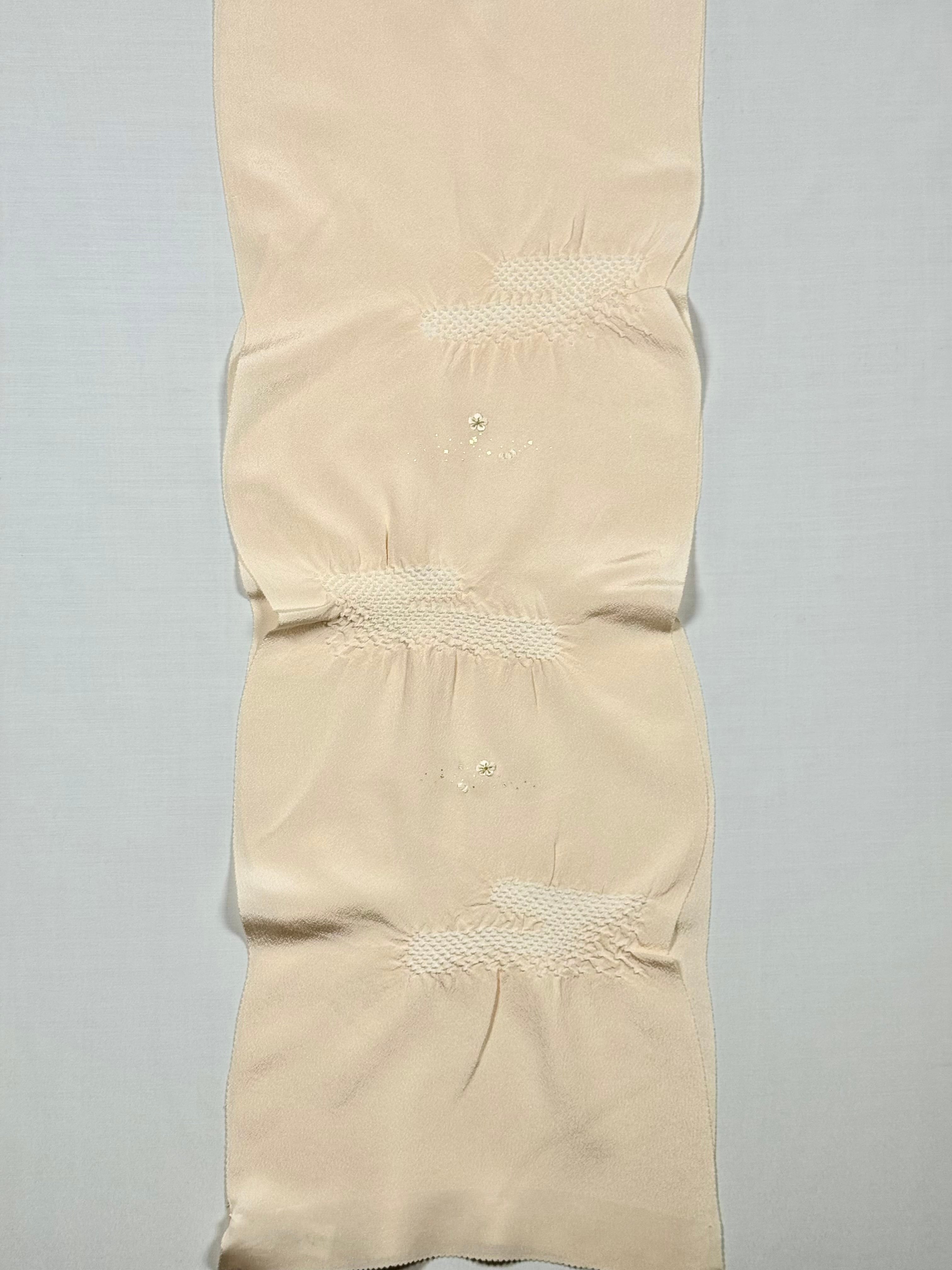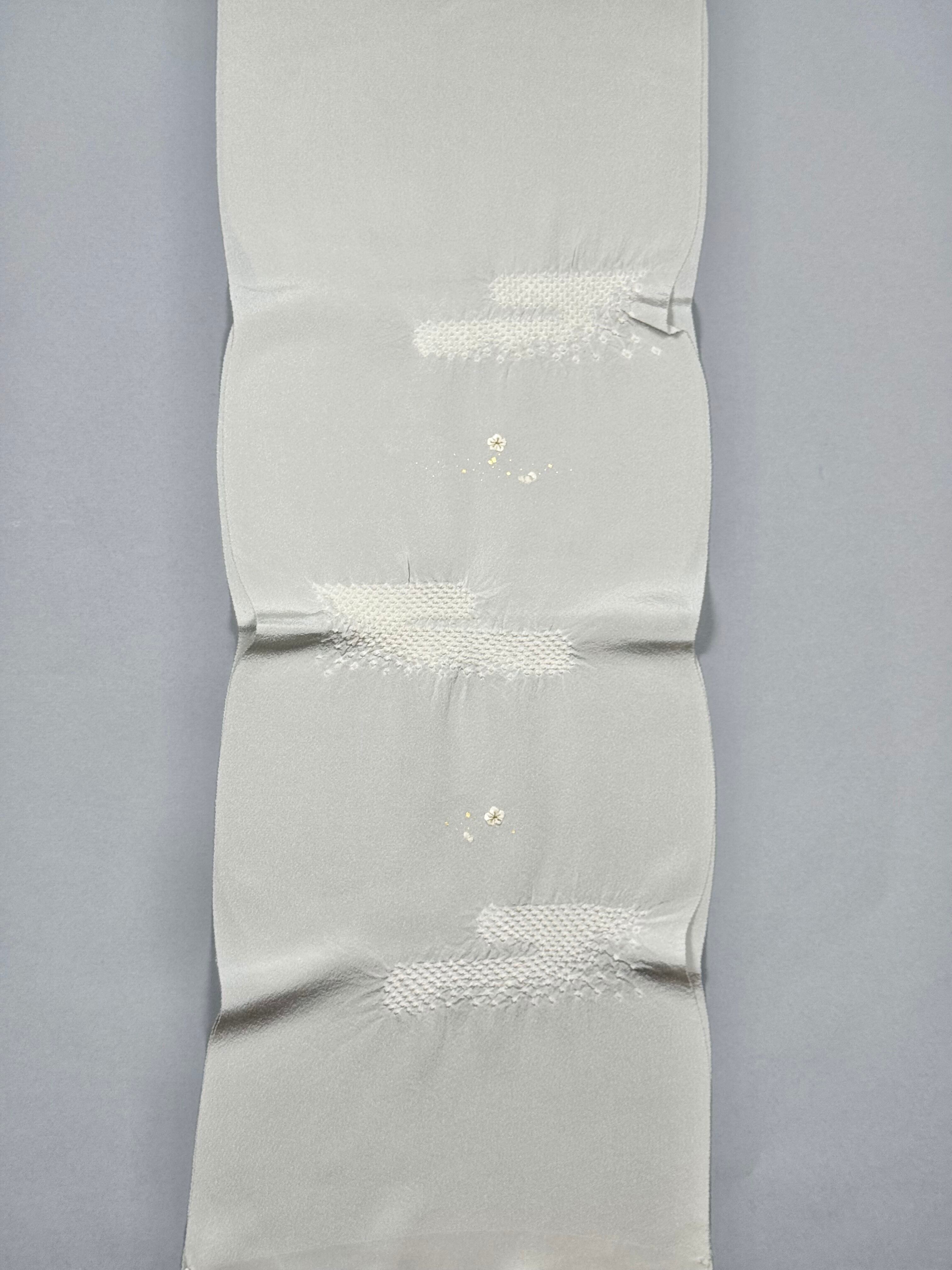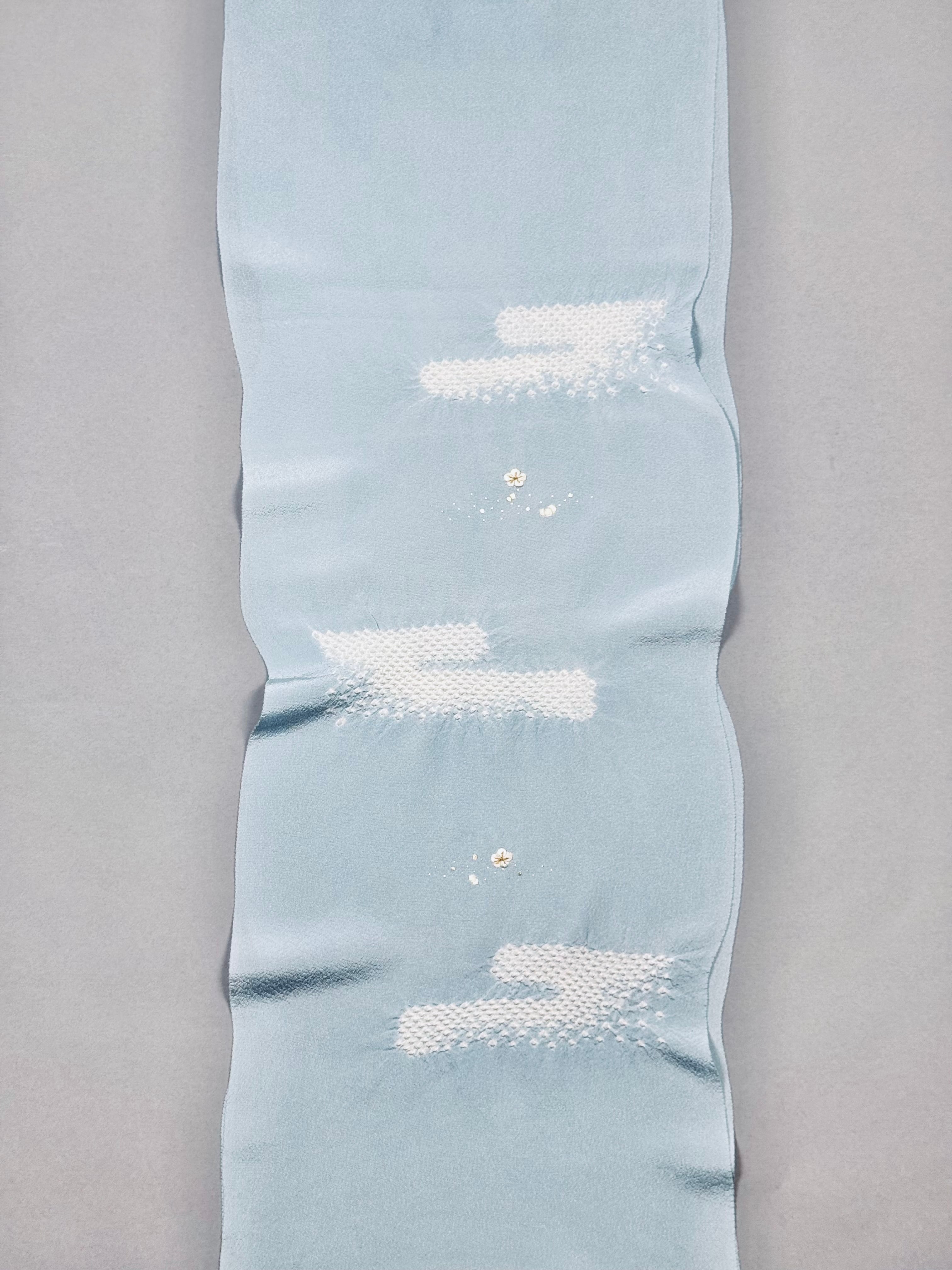 上品な光沢のある丹後ちりめんを使用し、日本古来の吉祥紋様のエ霞(えがすみ)を絞りでかたどった美しい帯あげです。絞りの配置によるぼかしの技法を効果的に用い、現れては消える霞がたなびく様子を表現しました。 美しい光沢感と繊細な小花の刺繍が魅力です。優雅で華やかなデザインながら、優しい絞りと落ち着きのある色合いが訪問着との相性抜群です。 卒業式や入学式などに参列されるお母さまの装いにおすすめです。 絹100% 日本製